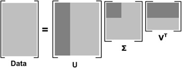 SVD示意图。矩阵Data被分解。浅灰色区域是原始数据,深灰色区域是矩阵近似计算仅需的数据