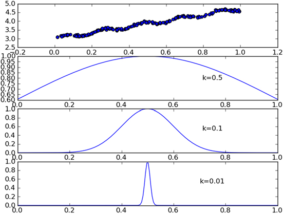 每个点的权重图(假定我们正预测的点是=0.5),最上面的图是原始数据集,第二个图显示了当k=0.5时,大部分的数据都用于训练回归模型,最下面的图显示的是当k=0.01时,仅有很少的局部点被用于训练回归模型。