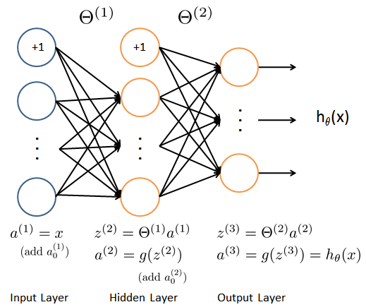 我们的神经网路如上图所示,它有3层构成(一个输入层,一个隐藏层a,一个输出层。)已经提供了一组训练参数(Θ1,Θ2)储存在ex3weights.mat中
