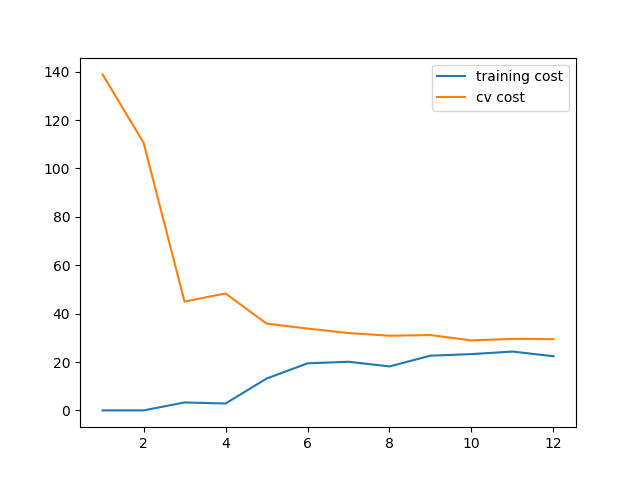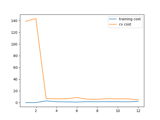 training_cost, cv_cost = [], [] # 计算训练集的代价和交叉验证(cross validation)集的代价