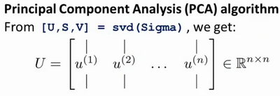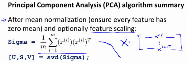 在 Octave 里我们可以利用奇异值分解(singular value decomposition)来求解,[U, S, V]= svd(sigma)。