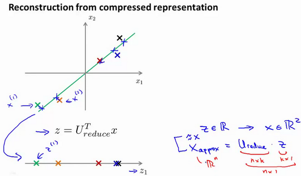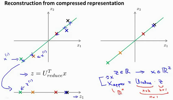 在压缩过数据后,我们可以采用如下方法来近似地获得原有的特征:$$x^{\left( i\right) }{approx}=Uz^{(i)}$$