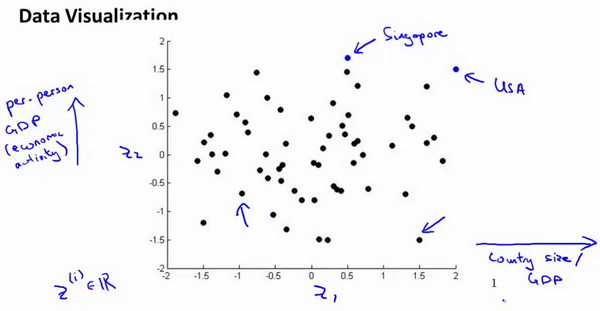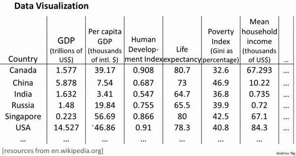 假使我们有有关于许多不同国家的数据,每一个特征向量都有50个特征(如GDP,人均GDP,平均寿命等)。如果要将这个50维的数据可视化是不可能的。使用降维的方法将其降至2维,我们便可以将其可视化了。
