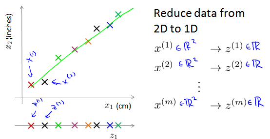 假使我们要采用两种不同的仪器来测量一些东西的尺寸,其中一个仪器测量结果的单位是英寸,另一个仪器测量的结果是厘米,我们希望将测量的结果作为我们机器学习的特征。现在的问题的是,两种仪器对同一个东西测量的结果不完全相等(由于误差、精度等),而将两者都作为特征有些重复,因而,我们希望将这个二维的数据降至一维。