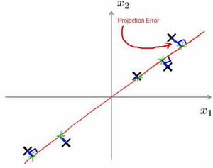 在PCA中,我们要做的是找到一个方向向量(Vector direction),当我们把所有的数据都投射到该向量上时,我们希望投射平均均方误差能尽可能地小。方向向量是一个经过原点的向量,而投射误差是从特征向量向该方向向量作垂线的长度。