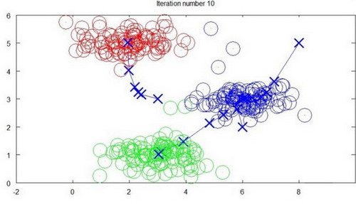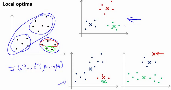 为了解决这个问题,我们通常需要多次运行K-均值算法,每一次都重新进行随机初始化,最后再比较多次运行K-均值的结果,选择代价函数最小的结果。