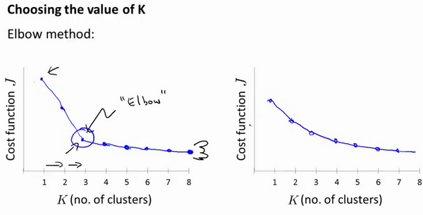 没有所谓最好的选择聚类数的方法,通常是需要根据不同的问题,人工进行选择的。选择的时候思考我们运用K-均值算法聚类的动机是什么,然后选择能最好服务于该目的标聚类数。