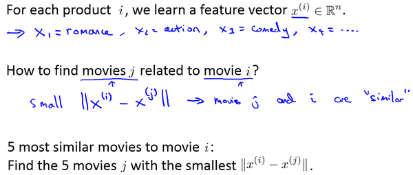 现在既然你已经对特征参数向量进行了学习,那么我们就会有一个很方便的方法来度量两部电影之间的相似性。例如说:电影