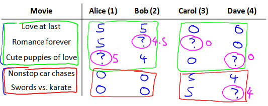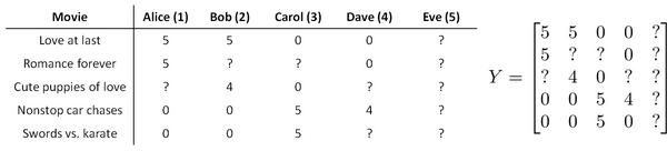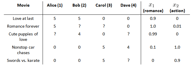 前三部电影是爱情片,后两部则是动作片,我们可以看出Alice和Bob似乎更倾向与爱情片, 而 Carol 和 Dave 似乎更倾向与动作片。并且没有一个用户给所有的电影都打过分。我们希望构建一个算法来预测他们每个人可能会给他们没看过的电影打多少分,并以此作为推荐的依据。