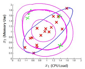 下图中是两个相关特征,洋红色的线(根据ε的不同其范围可大可小)是一般的高斯分布模型获得的判定边界,很明显绿色的X所代表的数据点很可能是异常值,但是其