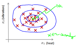 再一个例子是检测一个数据中心,特征可能包含:内存使用情况,被访问的磁盘数量,CPU的负载,网络的通信量等。根据这些特征可以构建一个模型,用来判断某些计算机是不是有可能出错了。