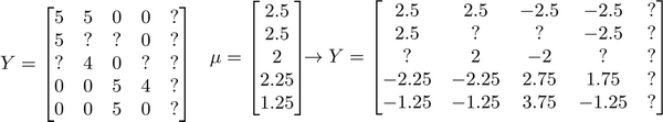 我们首先需要对结果 $Y $矩阵进行均值归一化处理,将每一个用户对某一部电影的评分减去所有用户对该电影评分的平均值: