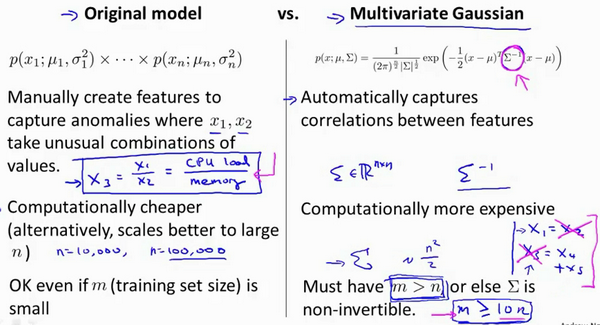 通过分别计算每个特征对应的几率然后将其累乘起来,在多元高斯分布模型中,我们将构建特征的协方差矩阵,用所有的特征一起来计算