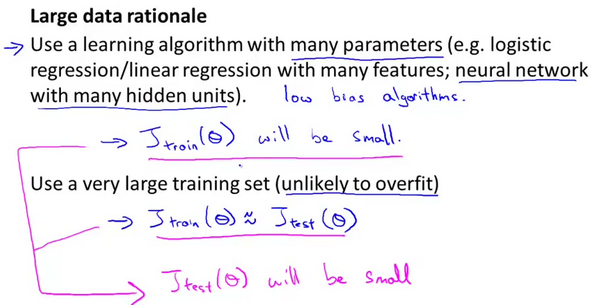 ​ 因此偏差问题,我么将通过确保有一个具有很多参数的学习算法来解决,以便我们能够得到一个较低偏差的算法,并且通过用非常大的训练集来保证。