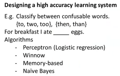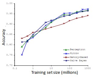 ​ 很多很多年前,我认识的两位研究人员Michele BankoEric Brill进行了一项有趣的研究,他们尝试通过机器学习算法来区分常见的易混淆的单词,他们尝试了许多种不同的算法,并发现数据量非常大时,这些不同类型的算法效果都很好。