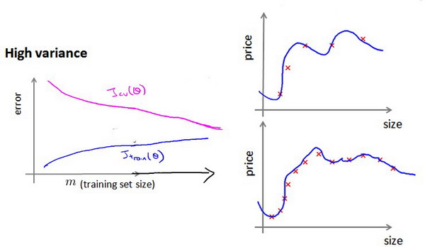 ​ 如何利用学习曲线识别高方差/过拟合:假设我们使用一个非常高次的多项式模型,并且正则化非常小,可以看出,当交叉验证集误差远大于训练集误差时,往训练集增加更多数据可以提高模型的效果。