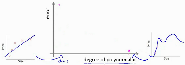 ​ 显然越高次数的多项式模型越能够适应我们的训练数据集,但是适应训练数据集并不代表着能推广至一般情况,我们应该选择一个更能适应一般情况的模型。我们需要使用交叉验证集来帮助选择模型。
