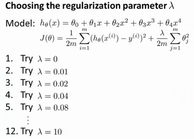 ​ 在我们在训练模型的过程中,一般会使用一些正则化方法来防止过拟合。但是我们可能会正则化的程度太高或太小了,即我们在选择λ的值时也需要思考与刚才选择多项式模型次数类似的问题。