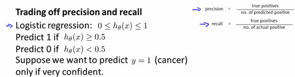 ​ 在这节课中,我将告诉你应该怎么做,同时也向你展示一些查准率和召回率作为算法评估度量值的更有效的方式。继续沿用刚才预测肿瘤性质的例子。假使,我们的算法输出的结果在0-1 之间,我们使用阀值0.5 来预测真和假。