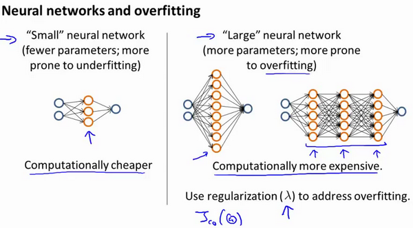 ​ 使用较小的神经网络,类似于参数较少的情况,容易导致高偏差和欠拟合,但计算代价较小使用较大的神经网络,类似于参数较多的情况,容易导致高方差和过拟合,虽然计算代价比较大,但是可以通过正则化手段来调整而更加适应数据。