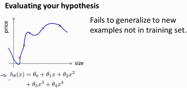 ​ 在本节视频中我想介绍一下怎样用你学过的算法来评估假设函数。在之后的课程中,我们将以此为基础来讨论如何避免过拟合和欠拟合的问题。